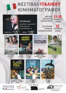 Η Στέγη Πολιτισμού Ανατολικής Μακεδονίας και Θράκης σε συνεργασία με το Ιταλικό Μορφωτικό Ινστιτούτο Αθηνών στο πλαίσιο της πρωτοβουλίας CIAK! – Αφιέρωμα στον Ιταλικό Κινηματογράφο παρουσιάζουν το Φεστιβάλ Ιταλικού Κινηματογράφου στην Περιφέρειας Ανατολικής Μακεδονίας και Θράκης. Από τις 21/11 έως τις 25/11 Μέγαρο Μουσικής Κομοτινής και Πολυχώρος Τέχνης & Σκέψης στην Ξάνθη Οι δύο βραδιές […]
