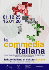 Το Ιταλικό Μορφωτικό Ινστιτούτο Αθηνών, σε συνεργασία με τον Πολιτιστικό Σύλλογο Imago, παρουσιάσει την έκθεση Κομέντια αλ’ιταλιάνα 01/12/2025 – 15/01/2026 Αίθουσα «Gattopardo» – Ιταλικό Μορφωτικό Ινστιτούτο (Πατησίων 47) Είσοδος ελεύθερη Ώρες λειτουργίας για το κοινό: Δευτέρα–Παρασκευή, 10:00–16:00. Μια έκθεση πρωτότυπων αφισών από ορισμένες ταινίες που σημάδεψαν την ιστορία της κωμωδίας στον ιταλικό […]