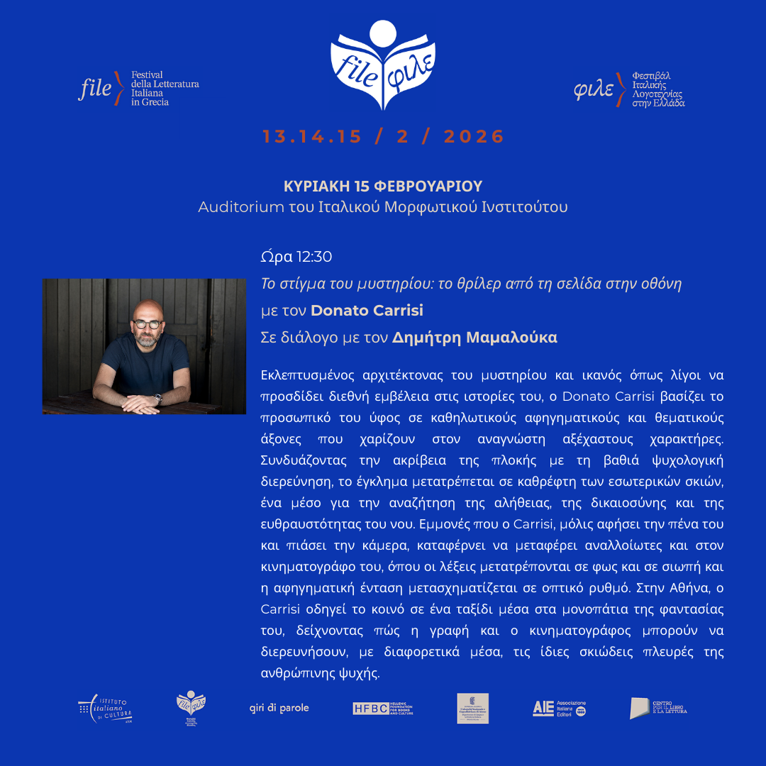 Στις 12:30, για την ενότητα ΦΙΛΕ://οπτικές, ο Donato Carrisi συμμετέχει στη συνάντηση Το στίγμα του μυστηρίου: το θρίλερ από τη σελίδα στην οθόνη. Σε διάλογο με τον Δημήτρη Μαμαλούκα (συγγραφέας), ο Carrisi θα οδηγήσει το κοινό σε ένα ταξίδι μέσα από το αφηγηματικό του σύμπαν, δείχνοντας πώς η γραφή και ο κινηματογράφος μπορούν να εξερευνήσουν, με διαφορετικά μέσα, τις ίδιες σκοτεινές ζώνες της ανθρώπινης ψυχής.