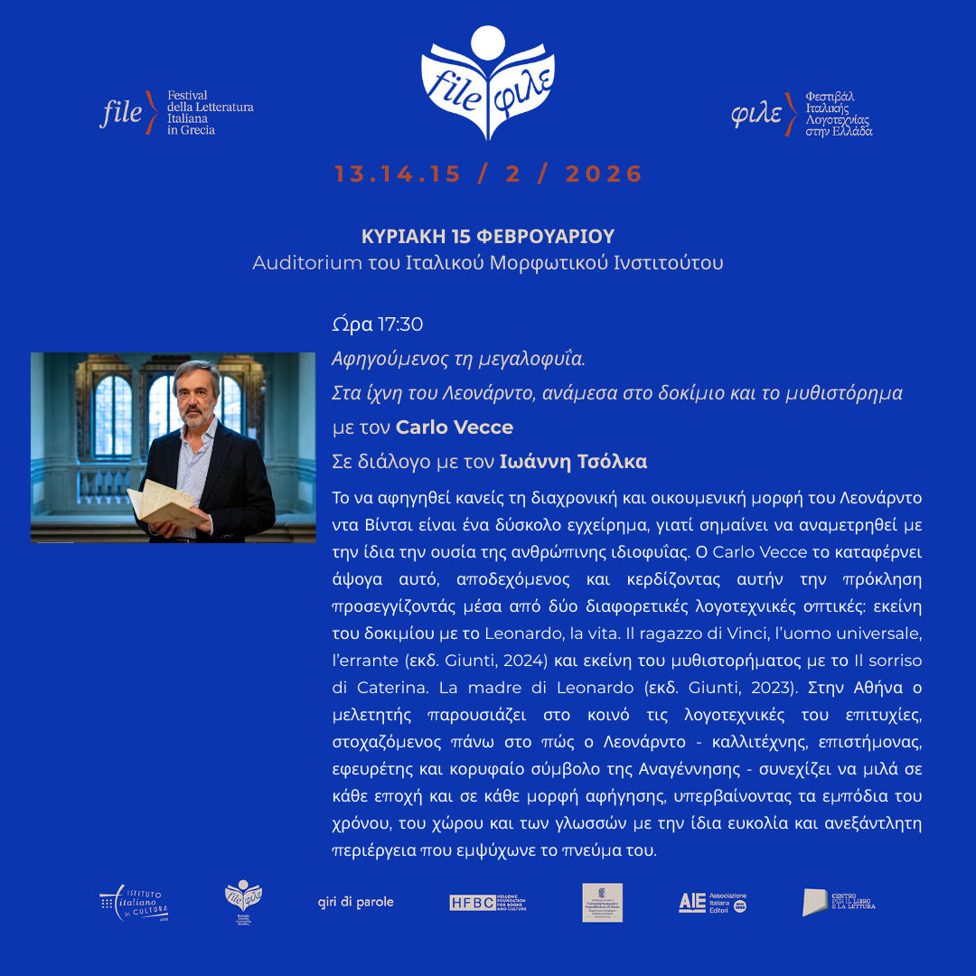 Στις 17:30, πάντα για την ενότητα ΦΙΛΕ://οπτικές, ο Carlo Vecce παρουσιάζει τη συνάντηση Αφηγούμενος τη μεγαλοφυΐα. Στα ίχνη του Λεονάρντο, ανάμεσα στο δοκίμιο και το μυθιστόρημα. Σε διάλογο με τον Ιωάννη Τσόλκα (Καθηγητή Ιστορίας της Ιταλικής Λογοτεχνίας και Ευρωπαϊκού Πολιτισμού, Εθνικό και Καποδιστριακό Πανεπιστήμιο Αθηνών), ο μελετητής θα εστιάσει στη μορφή του Λεονάρντο ντα Βίντσι και στο πώς η αφήγηση της ιδιοφυΐας συνεχίζει να μιλά στο παρόν μέσα από διαφορετικές λογοτεχνικές φόρμες.