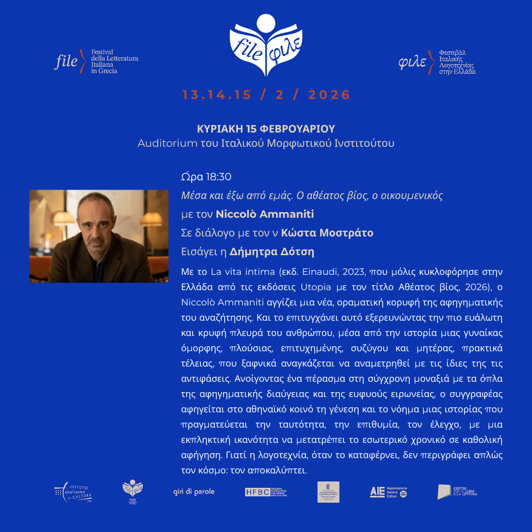 Στις 18:30, για την ενότητα ΦΙΛΕ://νέες ελληνικές κυκλοφορίες, ο Niccolò Ammaniti συναντά το κοινό με τη συζήτηση Μέσα και έξω από εμάς. Ο αθέατος βίος, ο οικουμενικός. Σε διάλογο με τον Κώστα Μοστράτο (δημοσιογράφος, Αθήνα 9.84) και με εισαγωγή από τη Δήμητρα Δότση (μεταφράστρια λογοτεχνίας), ο συγγραφέας θα παρουσιάσει το La vita intima, ένα μυθιστόρημα που διερευνά τις ευαλωτότητες και τις αντιφάσεις του ανθρώπου, μετατρέποντας την πιο ιδιωτική διάσταση σε οικουμενική αφήγηση.
