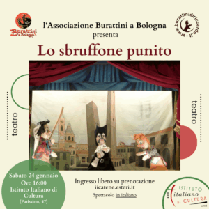 L’Istituto Italiano di Cultura di Atene e l’Associazione Burattini a Bologna presentano lo spettacolo Lo sbruffone punito Sabato 24 Gennaio – ore 16:00 Istituto Italiano di Cultura (Patission 47) Spettacolo in italiano E’ richiesta la prenotazione utilizzando il modulo sottostante Svenevoli civetterie da innamorati, la presenza di due vecchi padroni, la simpatica irriverenza […]