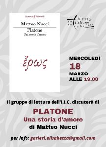 E’ in arrivo un nuovo incontro del Gruppo di Lettura in Italiano dell’Istituto Italiano di Cultura, organizzato dalla Dott.ssa Elisabetta Garieri, traduttrice. Il prossimo appuntamento sarà mercoledì 18 marzo alle 19:00 e il gruppo discuterà del libro “Platone: una storia d’amore” di Matteo Nucci (Feltrinelli). Per informazioni ed iscrizioni: garieri.elisabetta@gmail.com