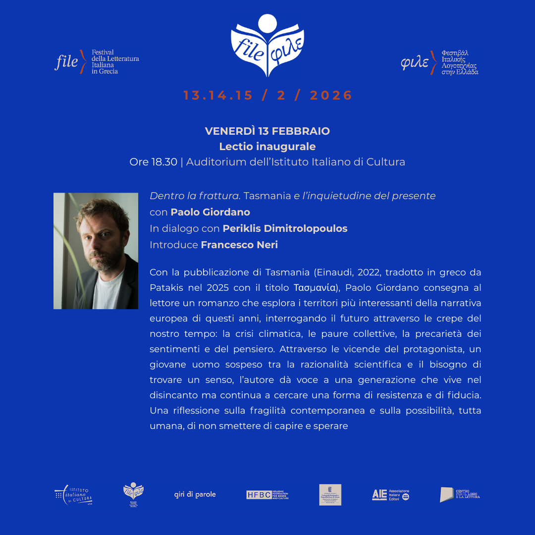 Protagonista dell’incontro sarà Paolo Giordano che, a partire dal suo intervento Dentro la frattura. Tasmania e l’inquietudine del presente, rifletterà sulle fratture che attraversano la contemporaneità. L’autore dialogherà con Periklis Dimitrolopoulos, Direttore di TO VIMA. L’incontro sarà introdotto da Francesco Neri, Direttore dell’Istituto Italiano di Cultura di Atene.