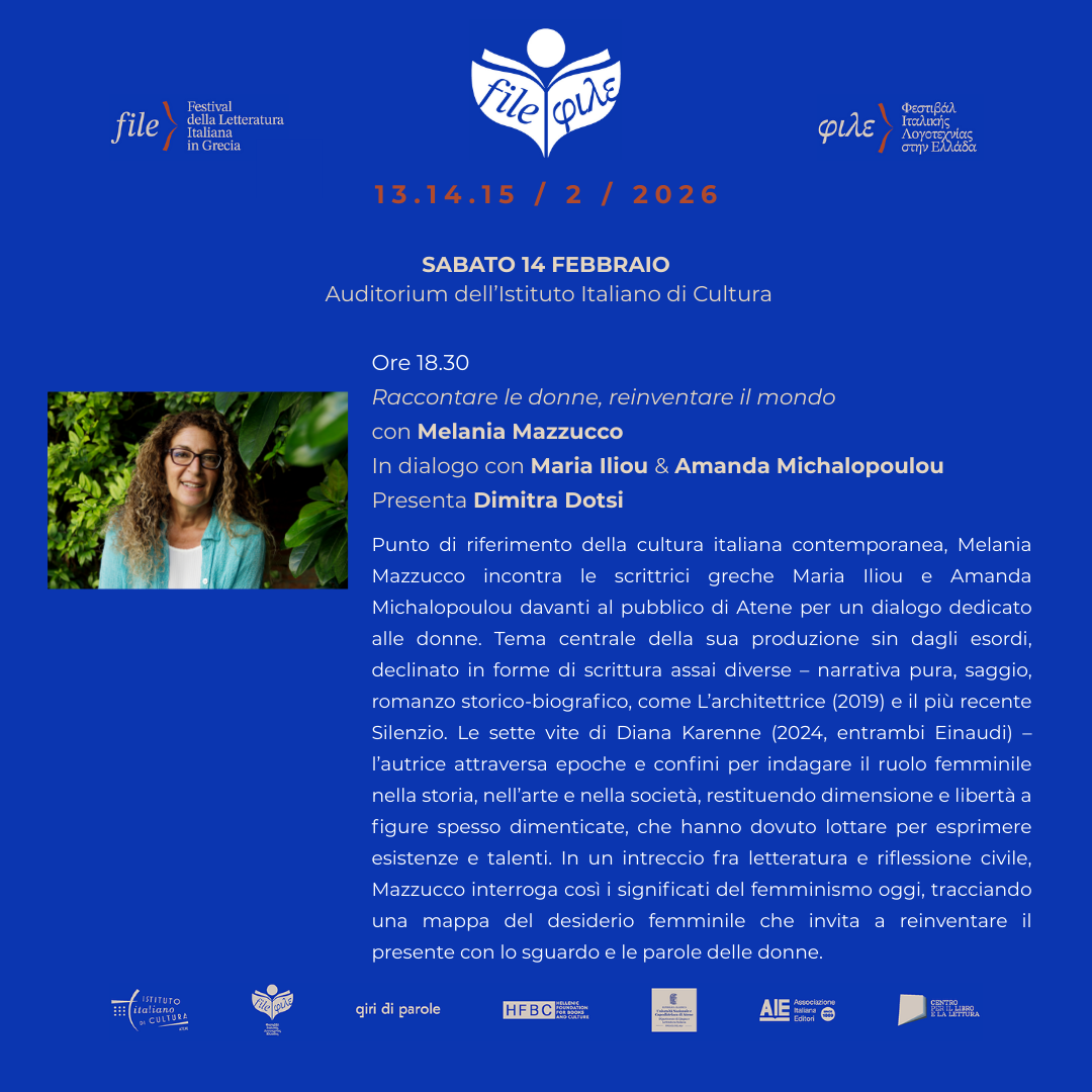 Nel pomeriggio, alle ore 18.30, per la sezione FILE://incontri, Melania Mazzucco incontrerà il pubblico ateniese con Raccontare le donne, reinventare il mondo. In dialogo con Maria Iliou e Amanda Michalopoulou, e con la presentazione di Dimitra Dotsi, l’autrice rifletterà sul ruolo delle donne nella storia, nell’arte e nella società, ripercorrendo una linea centrale della sua produzione letteraria e interrogando il significato del femminismo oggi.