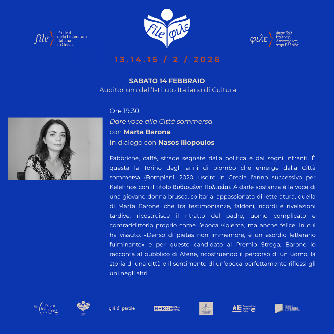 La giornata si chiuderà alle ore 19.30, con FILE://ritorni e l’incontro Dare voce alla Città sommersa. Marta Barone, in dialogo con Nasos Iliopoulos, racconterà il suo romanzo La città sommersa, un viaggio nella memoria individuale e collettiva che intreccia storia familiare, politica e trasformazioni urbane, restituendo il ritratto di un’epoca attraverso la storia di una città e di una generazione.