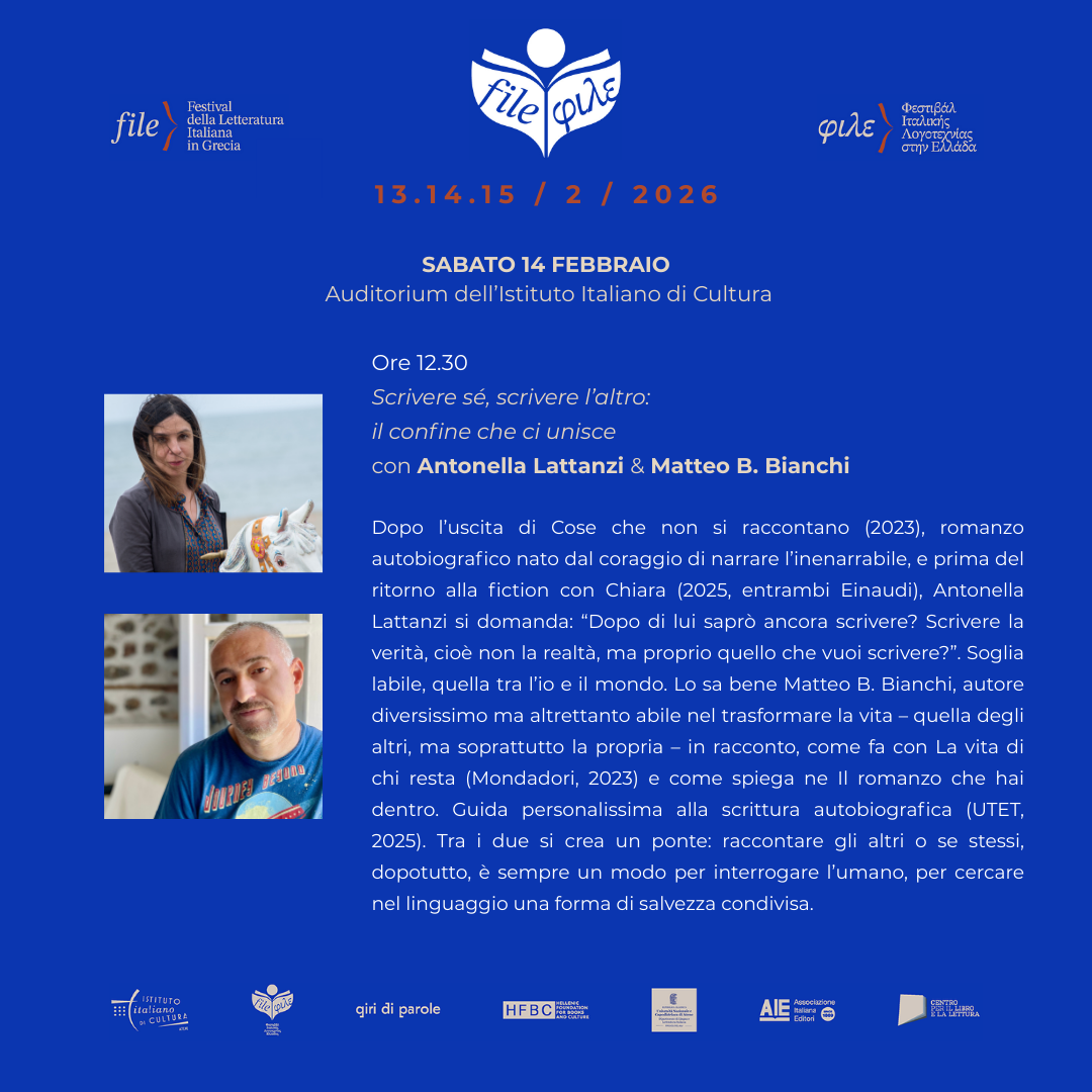 Alle ore 12.30, per la sezione FILE://officina, l’incontro Scrivere sé, scrivere l’altro: il confine che ci unisce vedrà dialogare Antonella Lattanzi e Matteo B. Bianchi. A partire dalle loro più recenti opere, i due autori esploreranno il confine tra autobiografia e finzione, interrogando il rapporto tra esperienza personale, scrittura e costruzione del senso, in un confronto intenso sul potere della letteratura di trasformare la vita in racconto condiviso.